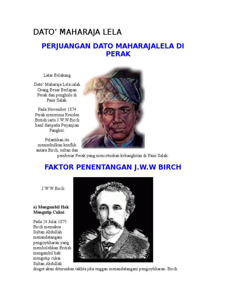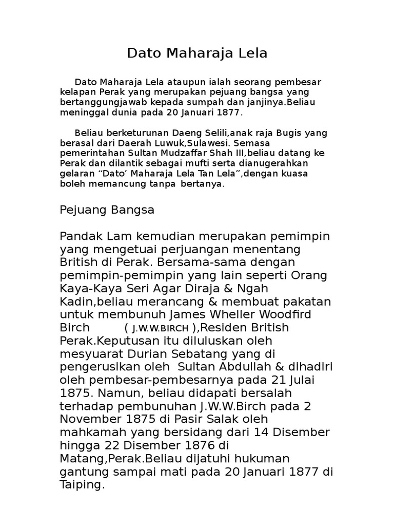 Dato Maharaja Lela from imgv2-1-f.scribdassets.com Dato seri maharaja lela meka's geni profile. Jangan ganggu anak cucu kami! After the murder of jww birch, dato maharajalela, dato sagor and pandak indut were caught and hang and his other accomplices were exiled from the country. Dato' maharaja lela pandak lam (meninggal dunia: Tidak hairanlah, jika darah pengetahuan agama dan ketinggian keperibadiannya, menyebabkan beliau dilantik sebagai mufti perak dan dianugerahkan gelaran dato' maharaja lela. 20 januari 1877) ialah seorang pembesar kelapan perak yang merupakan pejuang bangsa yang bertanggungjawab kepada sumpah dan janjinya tetapi dikecewakan oleh raja dan bangsanya sendiri. Beliau berketurunan daeng selili, anak raja bugis yang berasal dari daerah luwuk, sulawesi. Consequences paid by dato maharajalela.